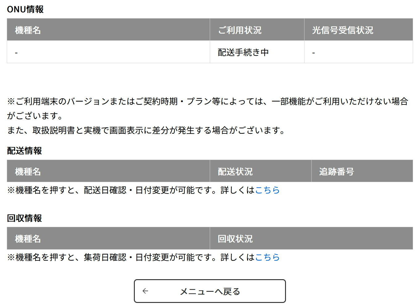 機種名をクリックすることで配送状況等に進む方式